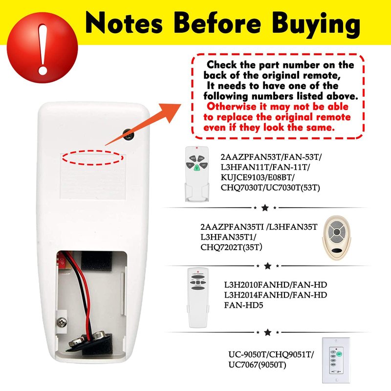 - 【Ceiling Fan Remote Control】Check the number on the back of the original remote control to make sure your original remote control matches the one shown in the picture. Otherwise even if they look very similar, they cannot replace your original remote if it is a different model. If in doubt about selection, please email to inquire about available models.