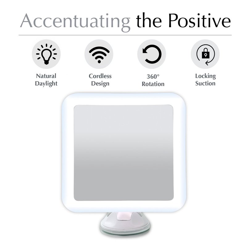 - ★ CORDLESS AND PORTABLE ★ Compact, battery operated, square design glass mirror; when folded, takes up fewer than 1/2 square foot of space. Comes with travel pouch!