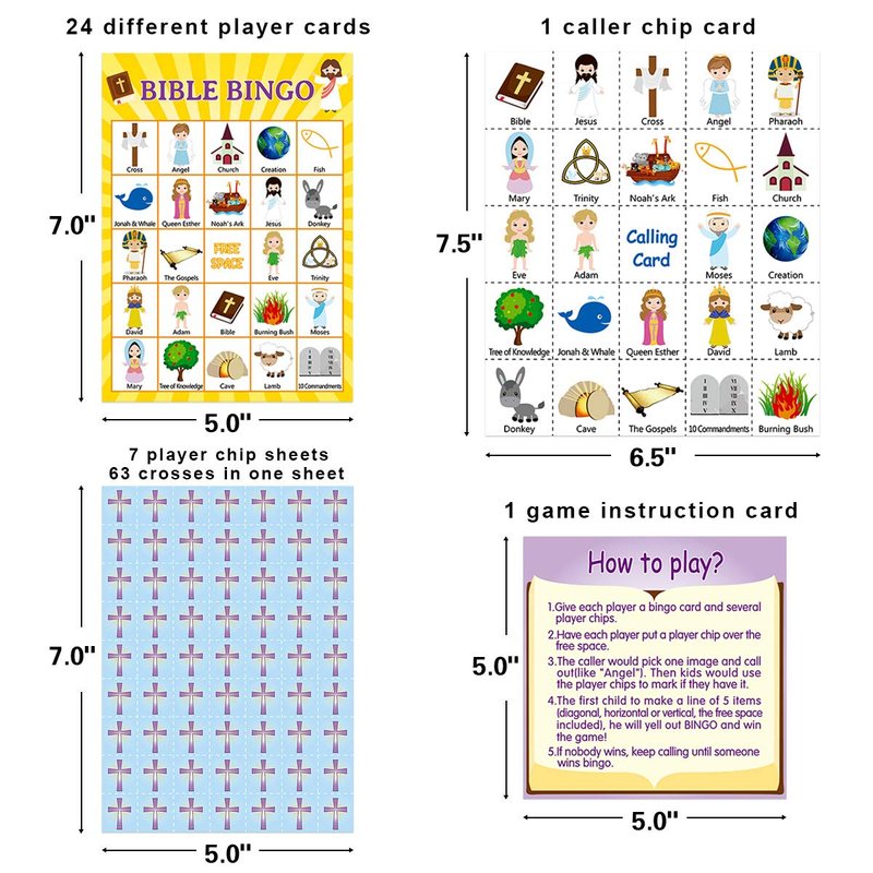 - Package included: 24 unique Bible Bingo Game Cards, 441 Cross Chips, 24 caller chips, and a Game Instructions