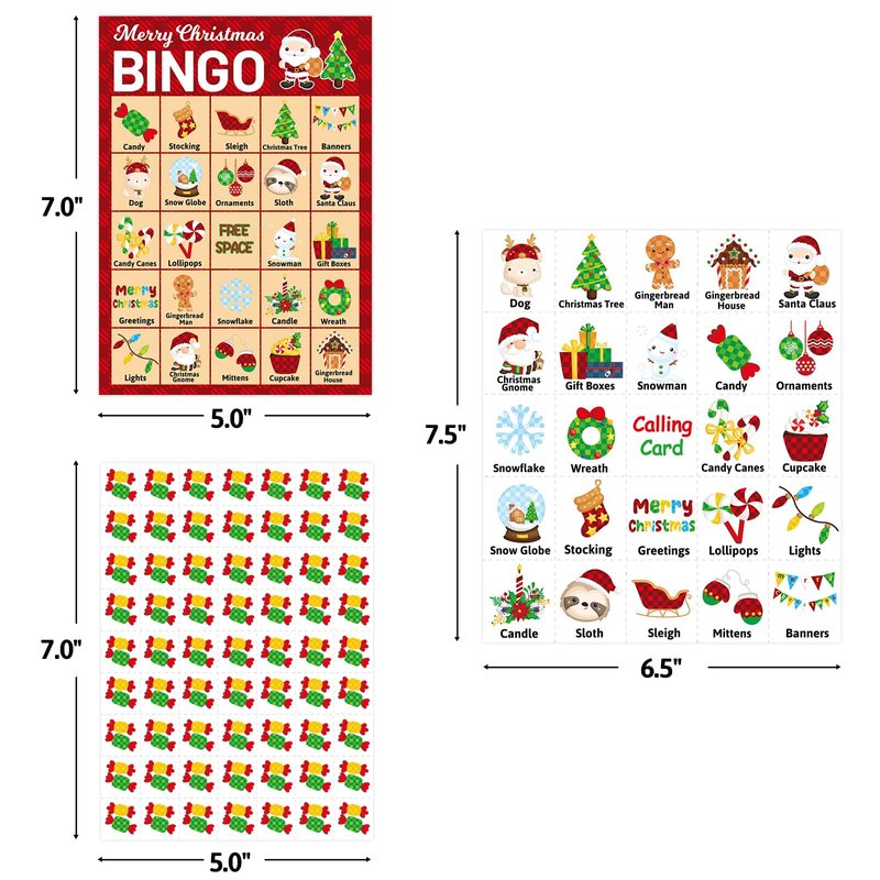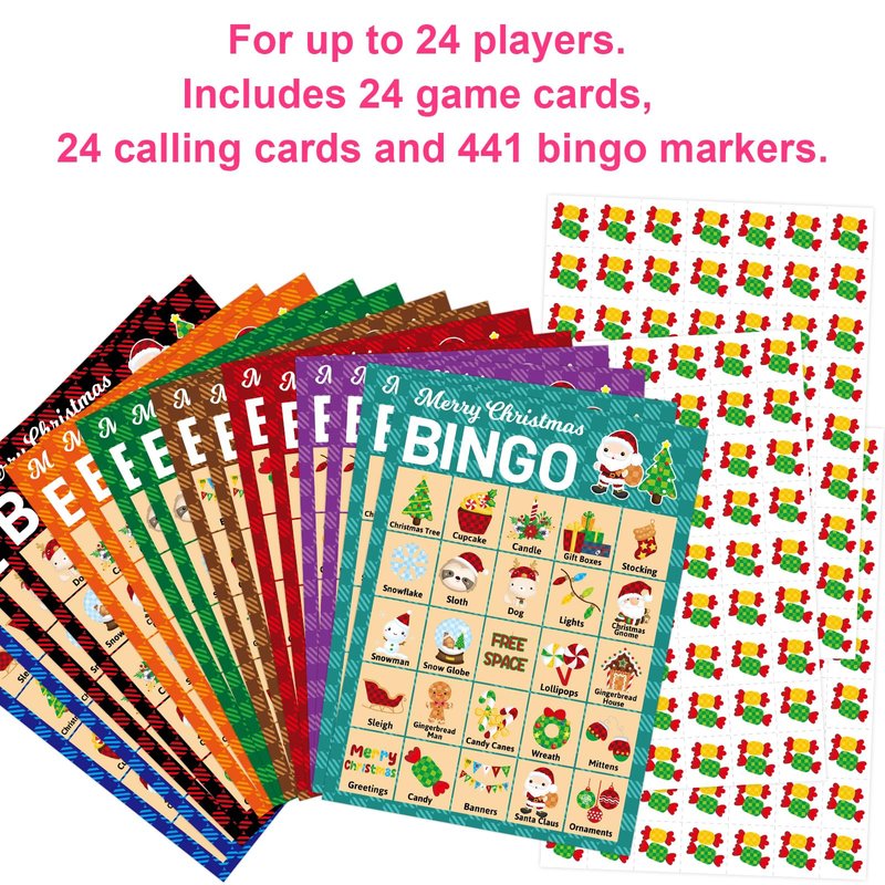 - Package Includes: 24 Merry Christmas theme bingo cards, 441 candy bingo card chips, 24 call out cards; 7 x 5 inches player cards; Easily cut along dotted lines of chips sheets and calling card sheet