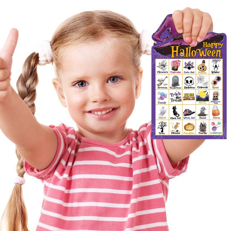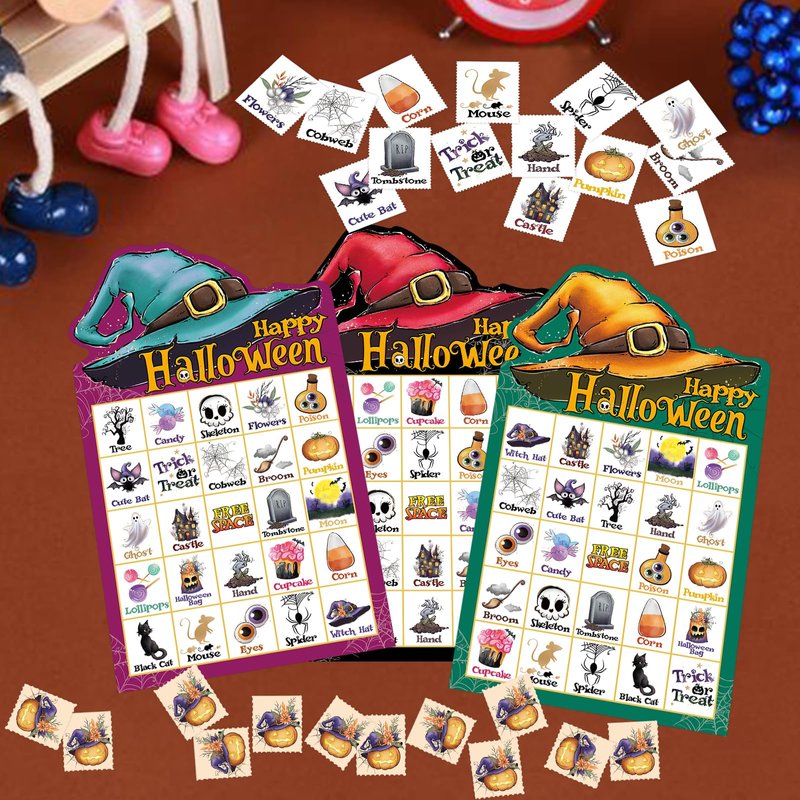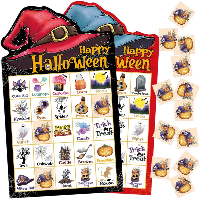 - Halloween Bingo Cards: Printed with popular Halloween elements, such as mouses, ghosts, brooms, candy and other Halloween elements; Great Halloween party favor for kids and adults