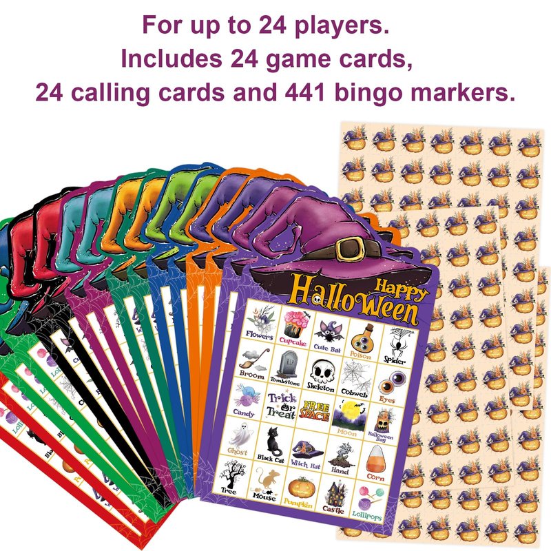 - Package Includes: 24 Halloween bingo game cards, 441 pumpkin bingo card chips, 24 call out cards; 8.6x 5 inches player cards; Easily cut along dotted lines of chips sheets and calling card sheet