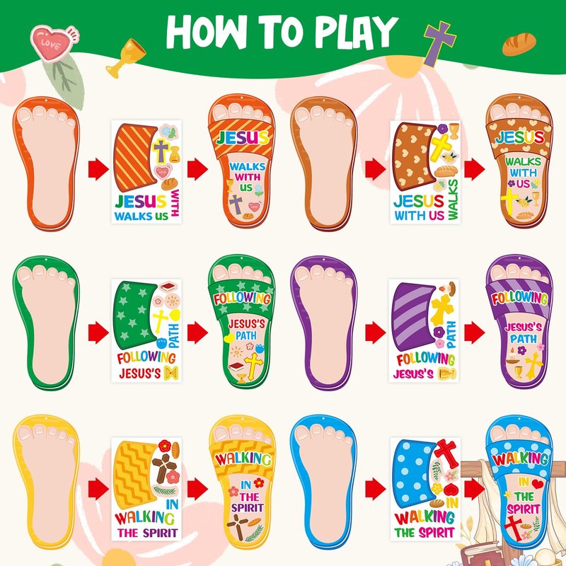 - Package Includes: 30 sets of Jesus walks with us sandal craft kits including 30 sandal cardboard in 6 designs with matching 30 sheets of stickers in 6 designs and 19.7ft strings