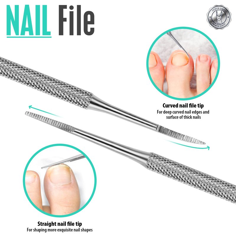 - 【Ergonomic Double Sided Nail File】-The stainless steel nail file consists of a straight end for filing the outer flat surface of the nails and a curved end for trimming the curved surface, nail edge and nail corners. Enable fast and precise shaping of your nails for excellent pedicure!