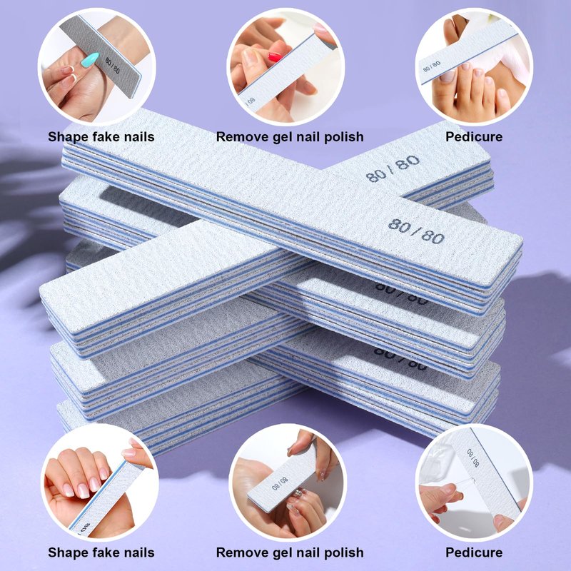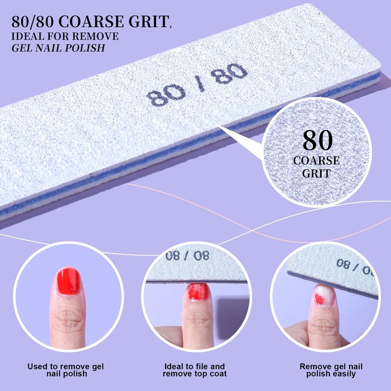 - 80/80 Grit Nail File: Specially designed with 80/80 coarse grit, ideal for remove gel nail polish, remove dip powder nails, remove acrylic nails. To remove gel nail polish, just file the surface of the nail to remove the top coat an then it’s more easier to remove gel nail polish. Compared with fine grit nail file, 80 grits is coarse grit, can file and remove thick, hard, tough nail surface easily and quickly.