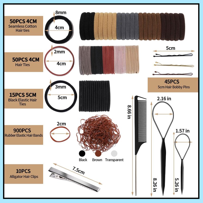 - Great Value Hair Ties Kit: Includes 900PCS rubber elastic hair bands( transparent, black and brown) and each color 300PCS + 15PCS 4mm black elastic hair ties + 50PCS 4mm seamless cotton hair ties 5colors and each color 10PCS + 50PCS 2mm hair ties 5 colors and each color 10PCS + 45PCS 5cm hair pins(black, brown, gold) and each color 15PCS + 10PCS alligator hair clips. 1PCS Rat Tail Comb & 2PCS Topsy tail. One kit includes 4 types hair bands and other hair accessories to meet your needs.