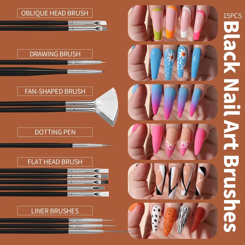 - Nail Design Tools: 15pcs nail art brushes includes flat head brushes, oblique head brushes, drawing brushes, liner brushes, fan shape brushes and doting brush for drawing thin lines, animal, flowers, leaves and all patterns you want. Dotting rhinestones and other nail decorations. Sweeping away excess glitter sequins. 5pcs nail dotting pen have the same size ball on one end and different sizes on the other for various sizes and patterns dotting and painting.