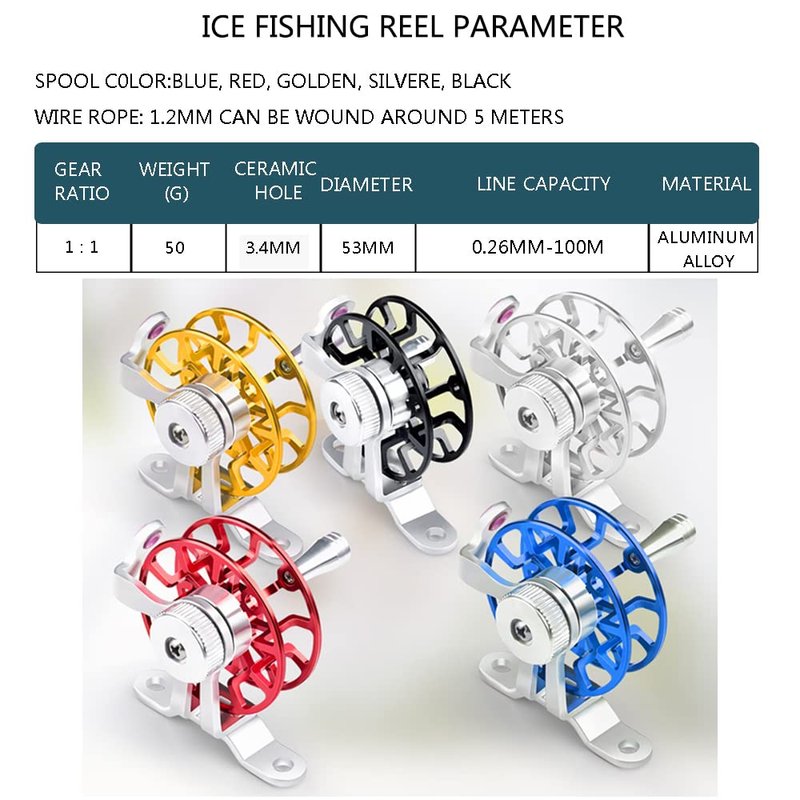 Winter Fishing Reel Description: Use modle: Only Right hand Diameter: 53m Line Capacity: 0.26mm-100m Material: Full aluminum alloy Weight: About 50g Gear ratio: 1:1 Ceramic hole diameter: 3.4mm