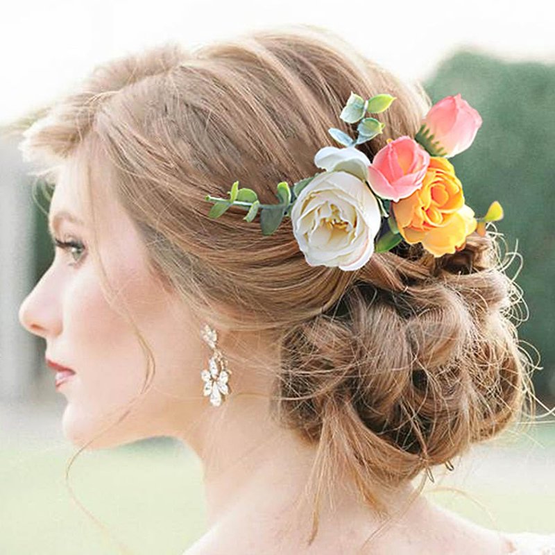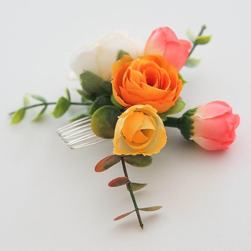 Fangsen Delicate White Orange Pink Ivory Rose Bud Leaf Rose Flower Hair Clips Floral Hair Accessories for Brides and Bridesmaids Silver (White+Orange+Pink)