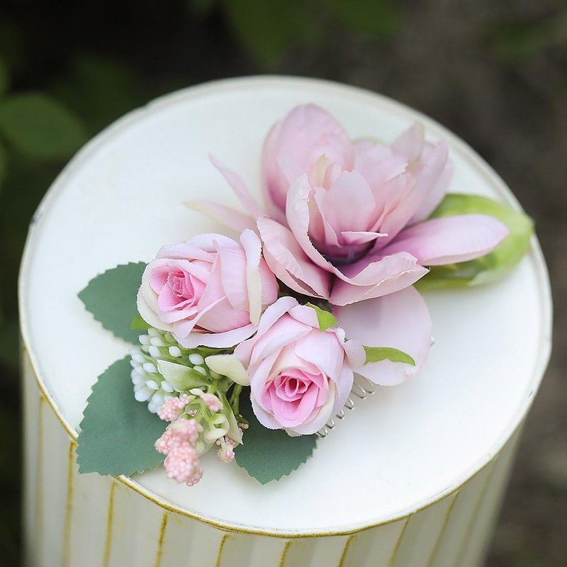 Fangsen Silver Boho Pink Rose Bud Floral Hair Comb Wedding Hair Accessories Floral Hair Piece Bridesmaid Hair Barrette Prom Flower Girl