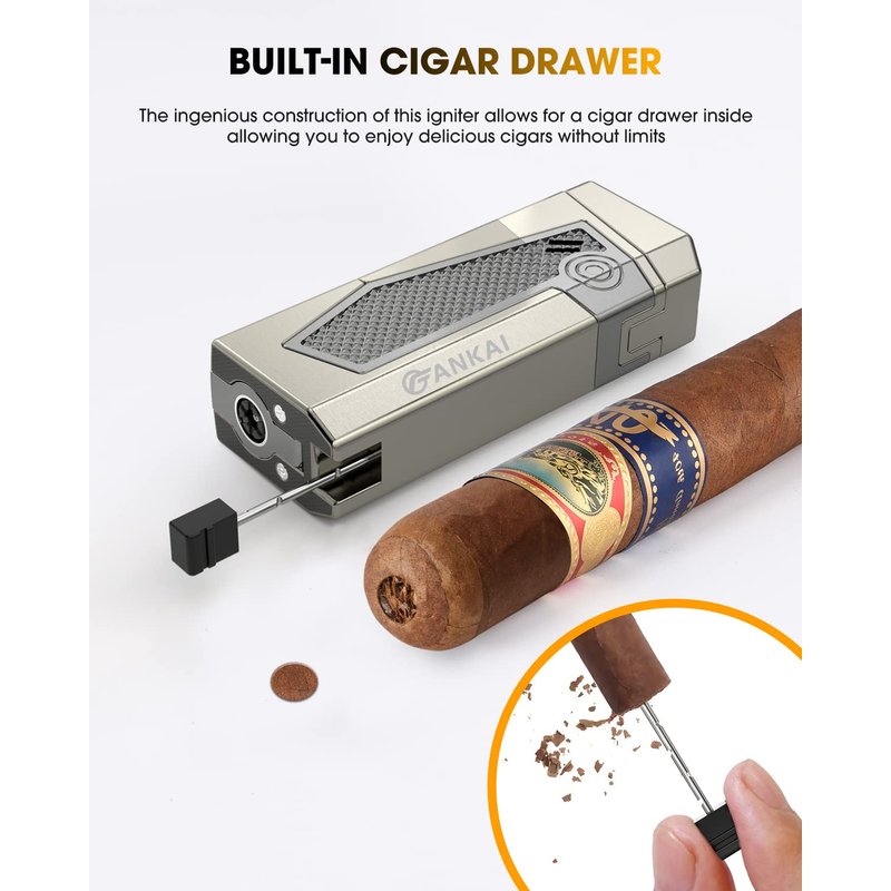 - [4 Jet Flame Torch Lighter] : High-pressure fire-breathing technology used in this cigar lighter,the flame is concentrated, strong and powerful;With the 4 jet blue fire,you can ignite a cigar in a few seconds and enjoy cigars more faster;In additional,windproof design makes you can use it no matter indoor or outdoor [WITHOUT BUTANE]