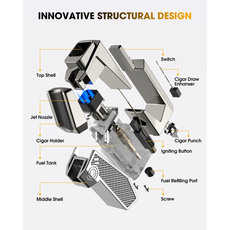 - [Durable Cigar Ligther]: Premium zinc alloy material,drawing craft r,plus electroplating polishing,all these procedure make this torch lighter sturdy,wear-resistant and high-temperature resistant ;The weight is 125 grams,you can get the top quality cigar lighter after received
