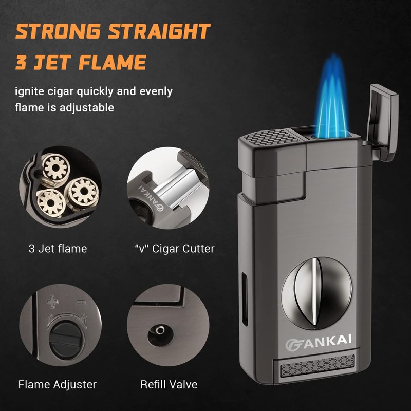 - 🔥Strong Straing Tripple Jet Flame🔥 The refillable lighters for smoking are built with 3 high-temperature-resistant ceramic nozzles and a strong, straight, high-pressure injection jet flame to help ignite cigars more evenly and quickly.