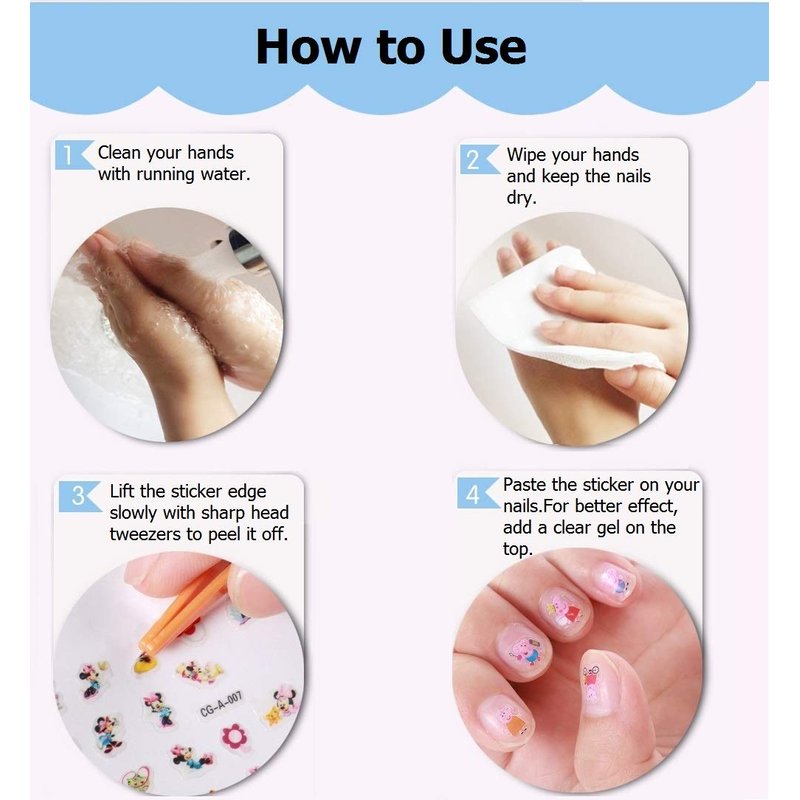 ❤Package includes 6 sheets assorted sized kids nail unicorn decals individual pack, self adhesive, just lift the sticker with sharp head tweezers and then peel it off to paste. You can also use nail gel on top to make the stickers last longer.