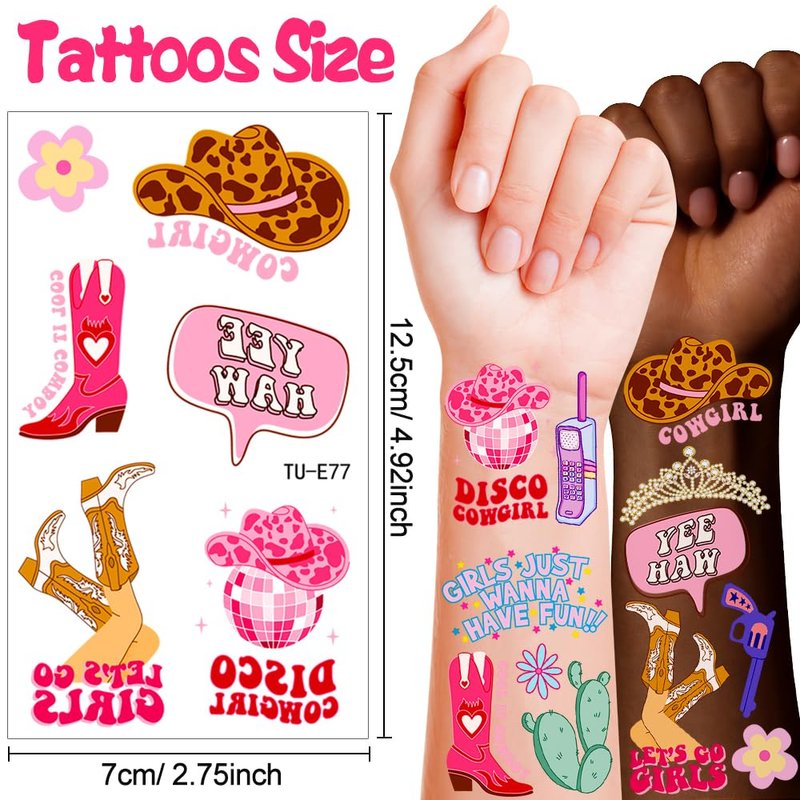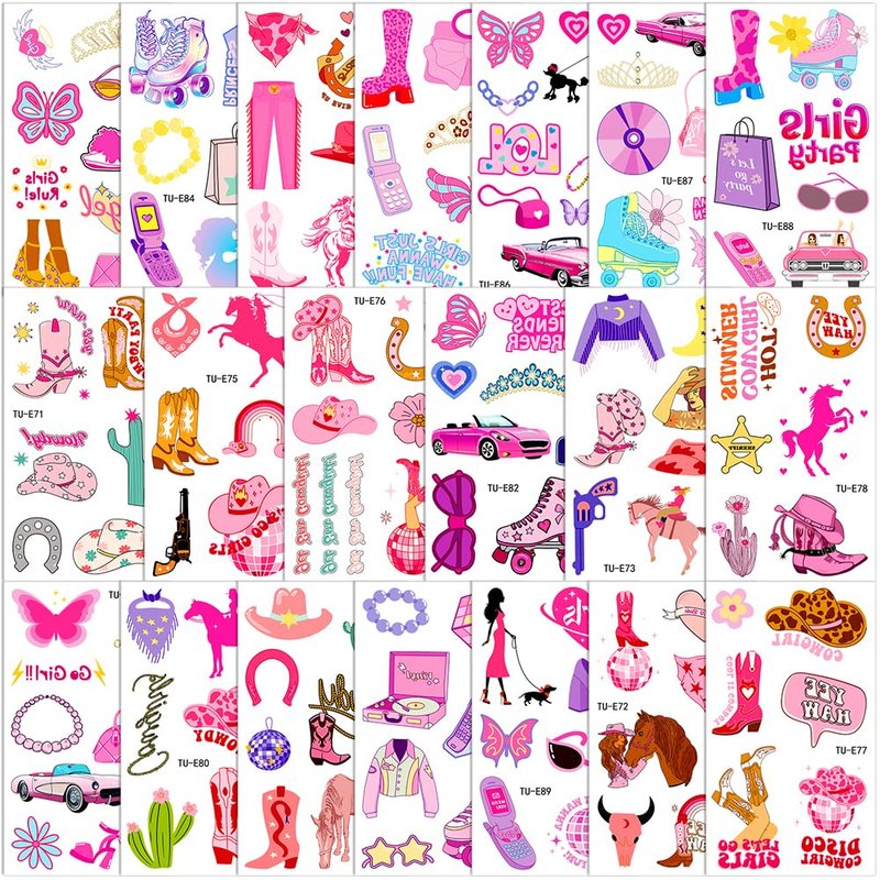 - Pink Birthday Party Decorations Accessories: Enough tattoo designs for the whole party for girls, kids, women, Butterfly, Crown, Pearl Necklace, Disco Ball, Cow Girls Boots, Cow Girls Hats, Lipstick, Convertible Cars, Tiaras, Skate Shoes, Bowtie Bags, Angel Wings Hearts, High Heels, Lovely Sunglasses, all girls favors characters, wil absolutely give your party a hit!