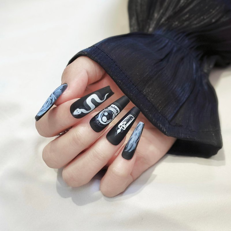 This is a long, gothic-style coffin nail set made from high-quality and safe materials, providing excellent wearing effects. The moderate thickness prevents your nails from breaking during the wearing process.