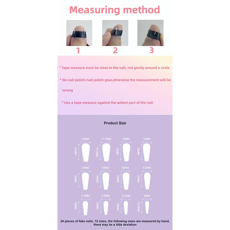 - 💅🏻Package Include💅🏻:The package includes 24 nail tips in 12 different sizes, alcohol wipes, a nail file, 24 jelly gaskets, and glue, ensuring everyone can find the most suitable nail tips for themselves.