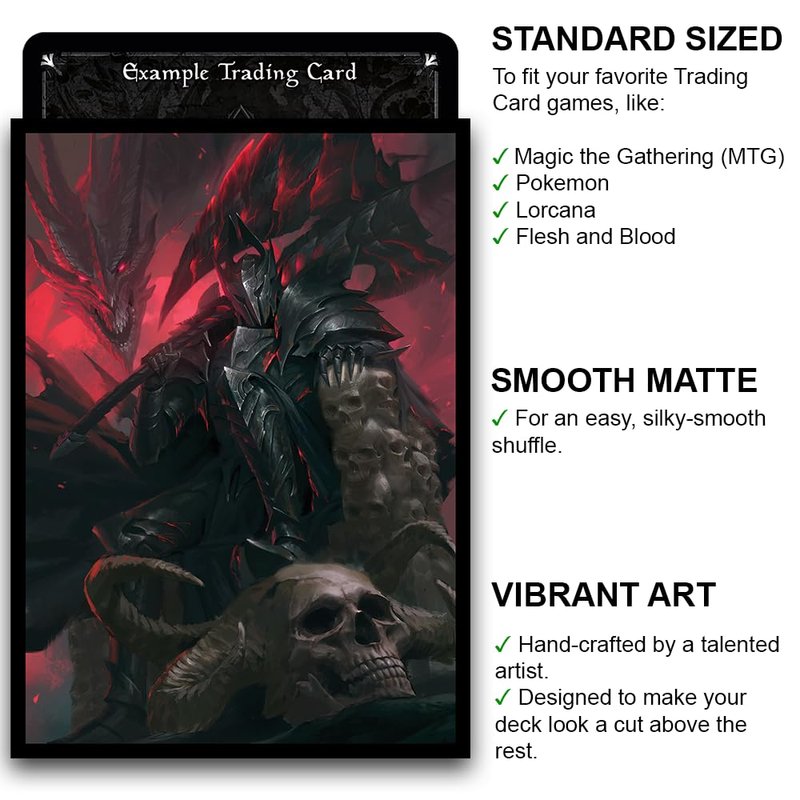 Fantasy North smooth matte art sleeves feature a non-textured matte surface that allows for a silky-smooth shuffling experience. They also feature a clear front side, allowing players to showcase their cards in full fidelity without the muted effect that is typical to matte fronts. Each sleeve features a unique artwork, conceived by the brand, then hand-crafted by a talented artist. Each pack contains 100 card sleeves that are 66mm x 92mm in size, fitting Standard-Sized card games such as MTG, Pokemon, Lorcana, Flesh and Blood, Sorcery and more. Play in style at your next casual, commander or other event!