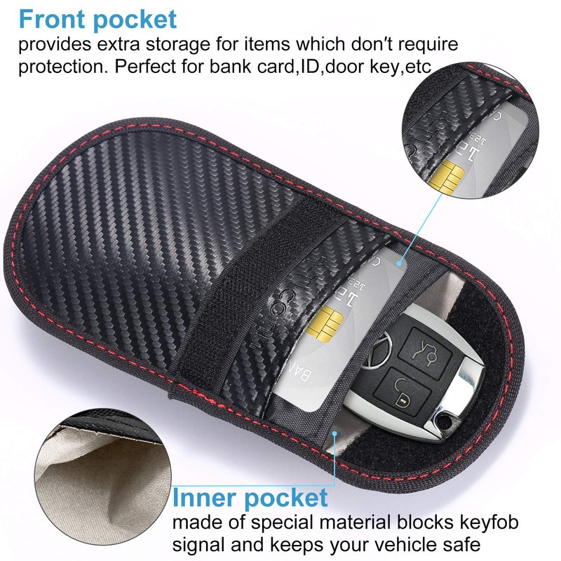 - ✔️【CONVENIENCE】 The smaller/front pocket is anti-radiation, best for storing ID card, bank cards, etc. The larger/back pocket is for signal blocking, best for storing car key fobs