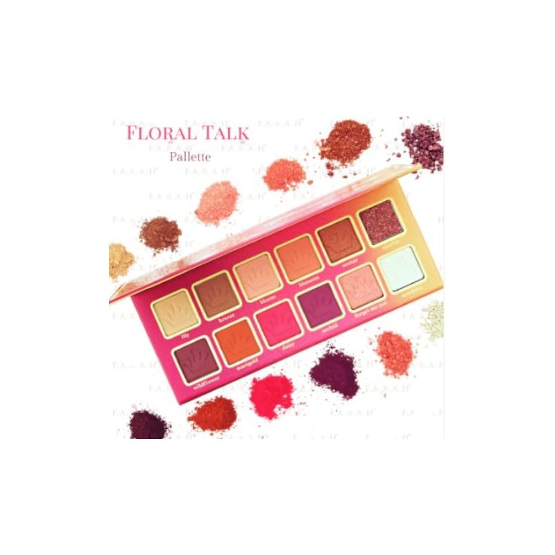 Transform your eye makeup routine with the F.A.R.A.H Floral Talk Eyeshadow Palette, a complete 12-color palette designed to bring out your inner artist. This versatile palette features a harmonious mix of matte, shimmer, and metallic shades, all inspired by the beauty of nature. The palette includes the following shades: Lily (soft ivory), Breeze (cool beige), Bloom (rosy pink), Blossom (peachy coral), Nectar (warm gold), Sparkle (glittering champagne), Wildflower (bold purple), Marigold (rich amber), Daisy (soft yellow), Orchid (deep plum), Forget Me Not (vibrant blue), and Sunshine (bright gold). Each shade is highly pigmented, blendable, and long-lasting, allowing you to create everything from subtle daytime looks to dramatic evening styles. The palette’s built-in mirror makes on-the-go application a breeze, making this palette your go-to for both everyday wear and special occasions.