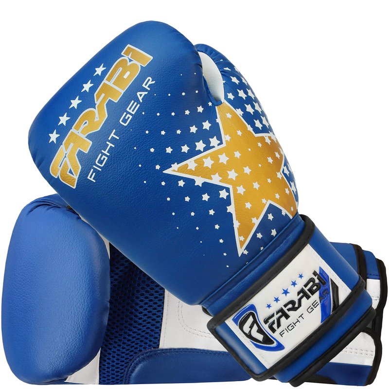 The Farabi Sports 6-oz Star kids punching gloves are made with of Ultra Quality Faux Leather. This junior boxing gloves can be used for a boxing, Training, MMA Muay Thai, Kickboxing, Punching, Boxing pad and Punching bag. Crafted for maximum output and comfort, these training gloves are not something you want, they are something you need.