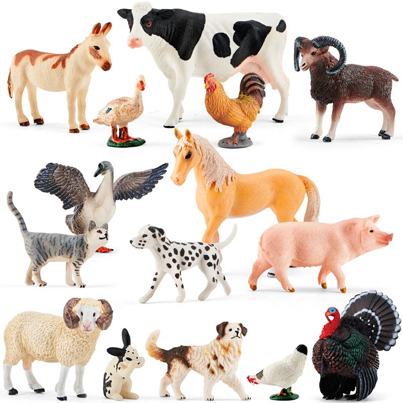 Farm Animal Toy Figure Set, 15Pcs Plastic Kid Farm Animal Toy Playset Cow Horse Goat Sheep Pig Donkey Goose Duck Turkey Chicken Dog Cat Rabbit for Toddler 3-5 5-7