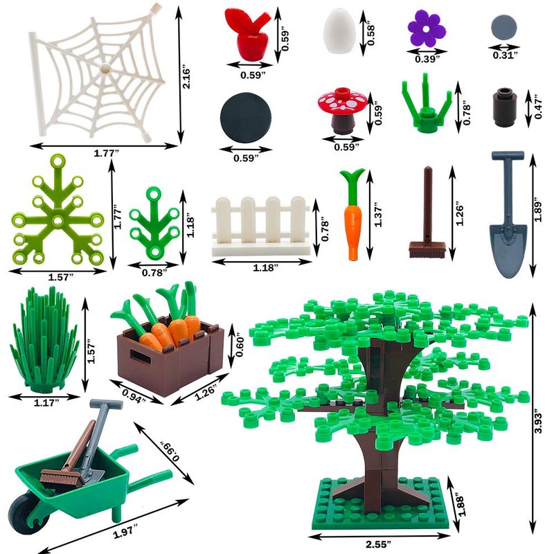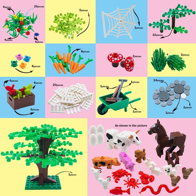 - Include 1 x ( 10" x 10" )Base Plate ,20 pieces picket fence,a variety of color flowers, leaves, fruit tree,Chicken, Cow, Horse, Cat, Dog, Egg, Pig, Carrot and more.