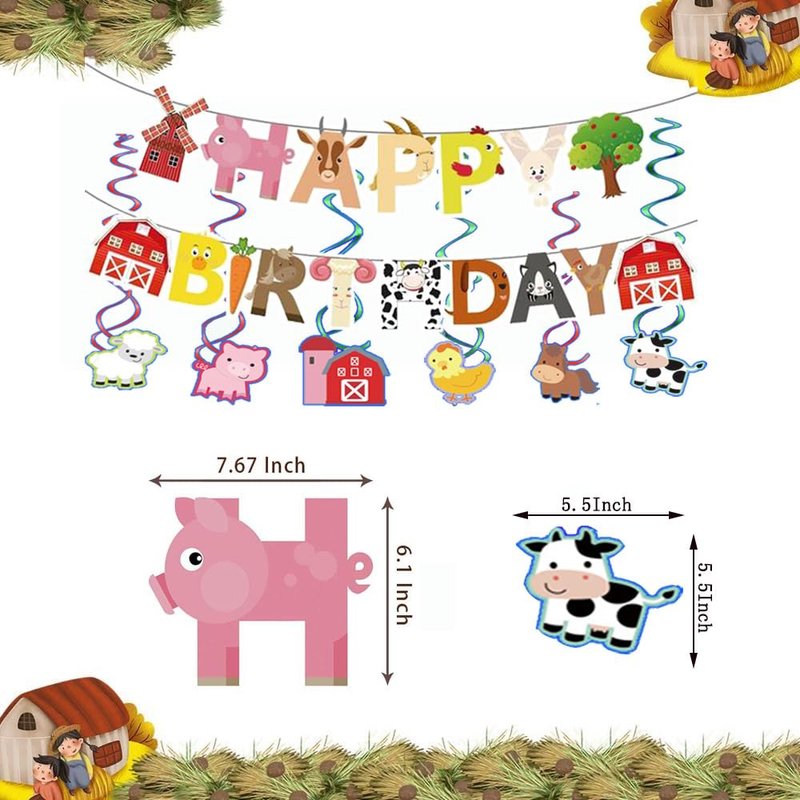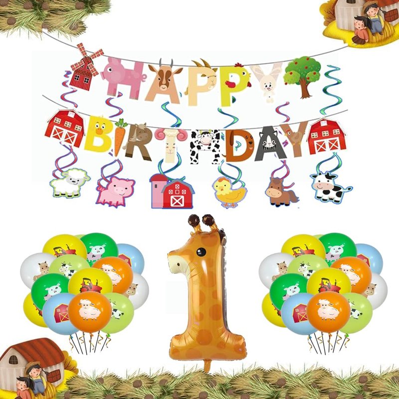 - Farm Decoration Set: The farm animal themed party decoration set includes 1 cute animal themed background in farm style, approximately 71 x 48 inches | 1 farm animal themed birthday banner | 1 farm animal barn flag wreath (6 farm animals) | 1 giraffe birthday balloon | 1 PCS pig balloon and 1 PCS cow balloon | 1 PCS horse balloon | 2 farm round balloons | 20 PCS color latex animal balloons, 2 ropes approximately 20 feet long.