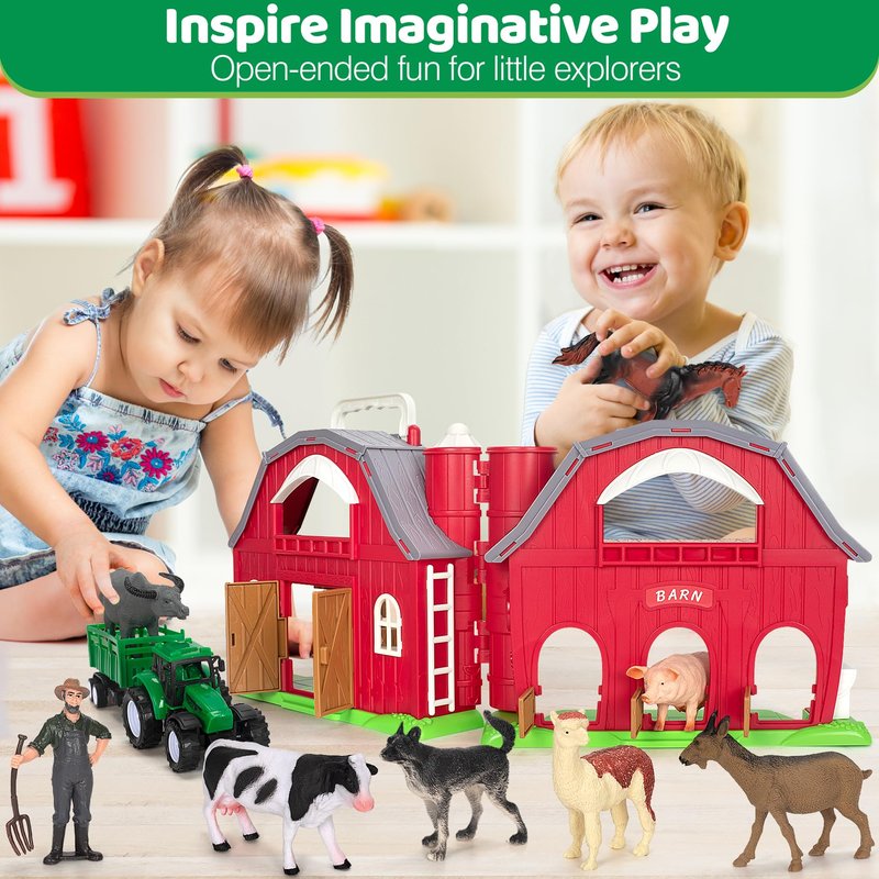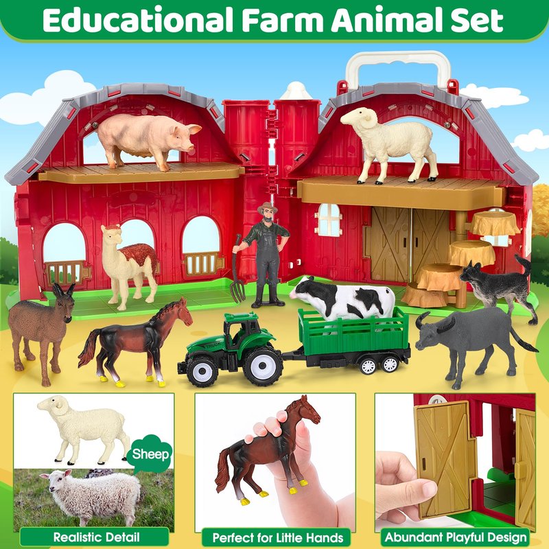 - Fun & Educational Farm Playset: Package includes one Big Red Barn and 10 Plastic farm play figurines (1 pig, 1 cow, 1 bull, 1 horse, 1 goat, 1 dog, 1 sheep,1 alpaca, 1 green tractor toy, and one farmer with shovel). These farm animals with realistic and cute designs are perfect for screen-free play and for introducing preschool kids ages 1-5 years to animal facts. Great for parent-child interaction and kindergarten preschool learning activities.