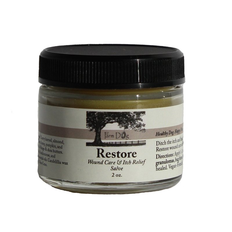 Farm Dog Restore Salve stops itching and helps dogs avoid secondary skin infections. We call it our 'vet in a jar'. Restore can be used on hot spots, bug bites, flea dermatitis and weepy skin. Heals cuts, scrapes, punctures, and open wounds. For dogs & horses only. Not for use on cats. Our salves are vegan, non-toxic, biodegradable and edible. ALWAYS CRUELTY-FREE. INGREDIENTS: Cherry kernel oil , organic rose hips oil*, hemp (Canada), almond*, apricot kernel oil,* pumpkin seed oil,* karanja oil and neem oil.* candilillia wax,*unrefined shea butter, and essential oils of carrot seed, frankincense, patchouli, peppermint*, geranium, non-GMO Vitamin E. * USA sourced. NOT FOR CATS