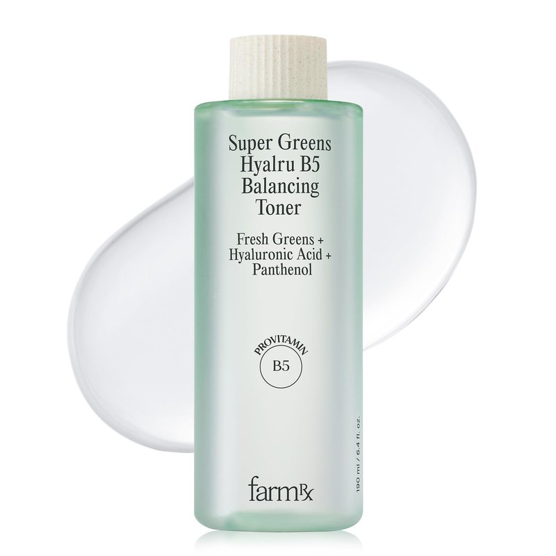 - FARM RX SUPER GREENS HYALRU B5 BALANCING TONER (190ml/6.4fl oz) - This lightweight, water-based toner deeply hydrates and refreshes your skin. Infused with Hyaluronic Acid, Pro-Vitamin B5, and Super Greens, it locks in moisture, leaving your skin feeling plump and supple throughout the day.