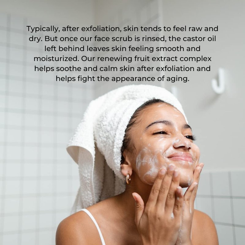 Instantly rejuvenate with our clean and green face and body scrub made from our blend of nourishing vitamins and fruit extracts. The aroma of vanilla, coconut and anise is sweet and soothes the skin during exfoliation. This luxurious scrub contains no plastic microbeads, which are not only abrasive, but also not eco-friendly. Instead, we use sodium bicarbonate and jojoba esters that dissolve in water and break upon application providing a much gentler exfoliation for a refreshing, softer feel. Typically, after exfoliation, skin tends to feel raw and dry. But once our face scrub is rinsed, the castor oil left behind leaves skin feeling smooth and moisturized. Our renewing fruit extract complex helps soothe and calm skin after exfoliation and helps fight the appearance of aging. Fruits in our herbal blend: Anise, Coconut, Raspberry, Vanilla, Cucumber Melon, Pineapple, Apricot. Manufactured in USA