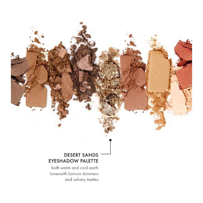 - Desert Sands Eyeshadow: An eyeshadow palette that reinvents earth tones with 9 highly pigmented shades, ranging from flattering warm and cool earth tones with lustrous shimmers and velvety mattes. A versatile eyeshadow palette for easy neutral-toned look - from soft to intense, with matte and shimmery finishes.