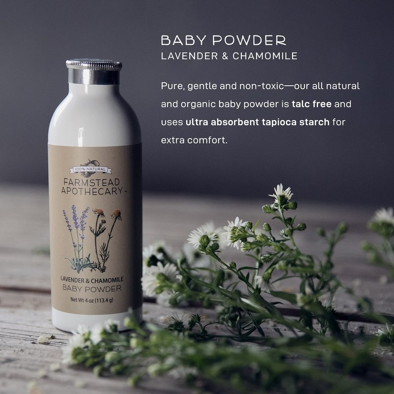 - BABY POWDER LAVENDER & CHAMOMILE - Your baby's bottom will thank you for using our luxurious baby powder. Made with soothing lavender, chamomile and calendula, our all natural and organic baby powder is talc free and uses ultra absorbent tapioca starch for extra comfort. Pure, gentle and non-toxic, you can't go wrong with this crowd pleaser!