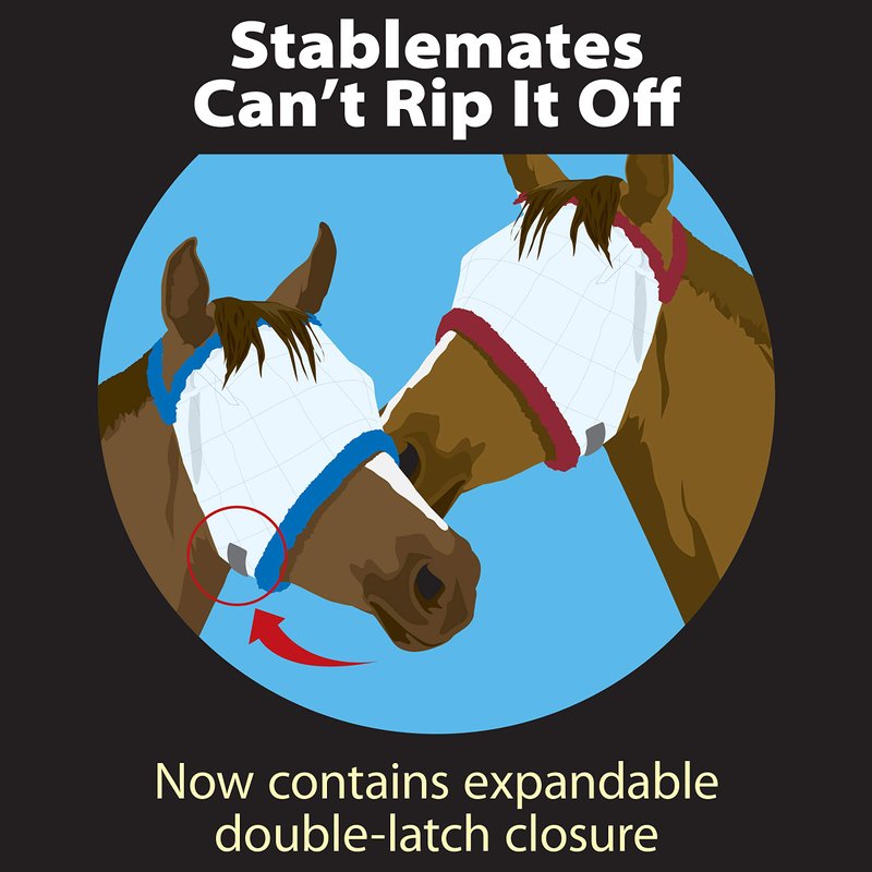 - THE FLY MASK DOUBLE-LATCH CLOSURE is located under the jaw, not on the cheekbone, making it harder for other horses to reach