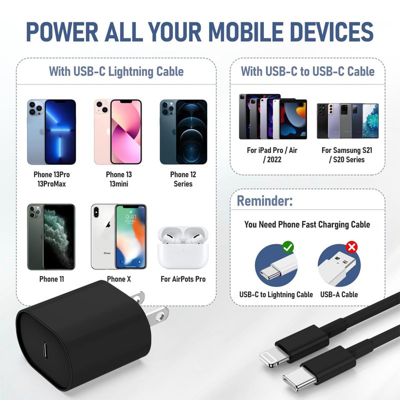 - Universal Compatible : Compatible with iPhone 14/14 Pro/13/13 Mini/13 Pro/13 Pro Max/12/12 Mini/12 Pro/12 Pro Max/SE 2020/11/11 Pro/11 Pro, for iPad. This 20 USB Wall Fast Charger also charge for Phone 7 6 Plus, 5 5c 5s SE in a Original Charging Speed