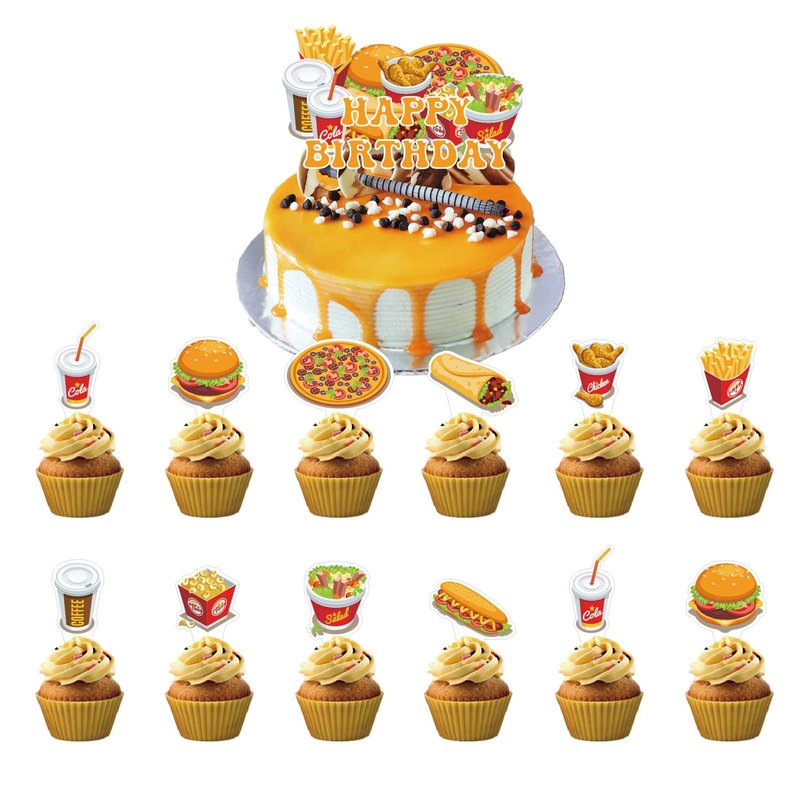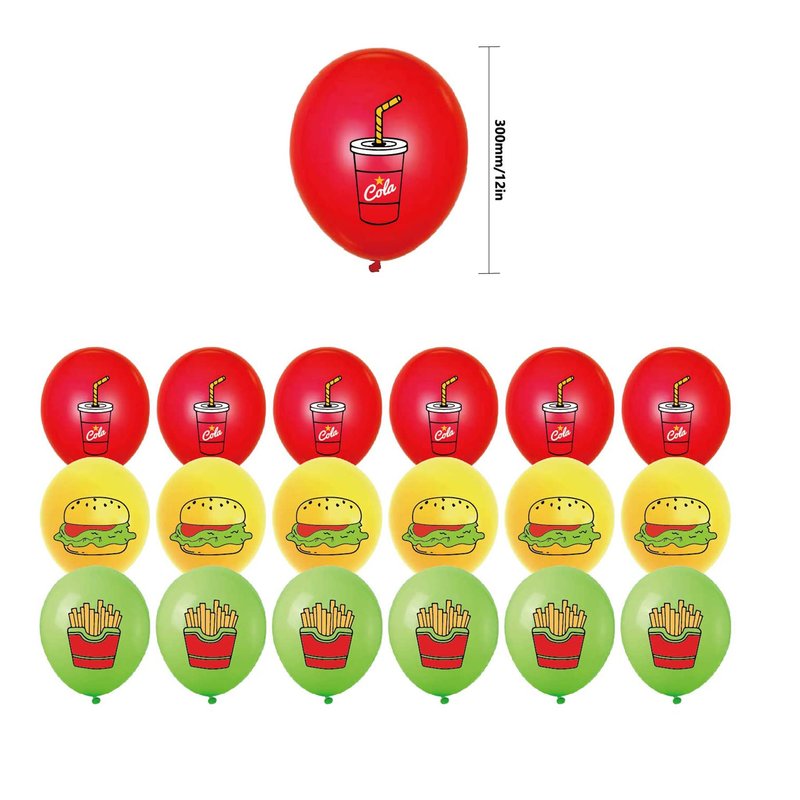 - Package includes: Fast food birthday party supplies set includes 1 * HAPPY BIRTHDAY banner, 18 * latex balloon (3 styles of 6 each), 1 * cake topper, 12 * cupcake topper, each accessory has fast food elements, these decorations will add fun to your party