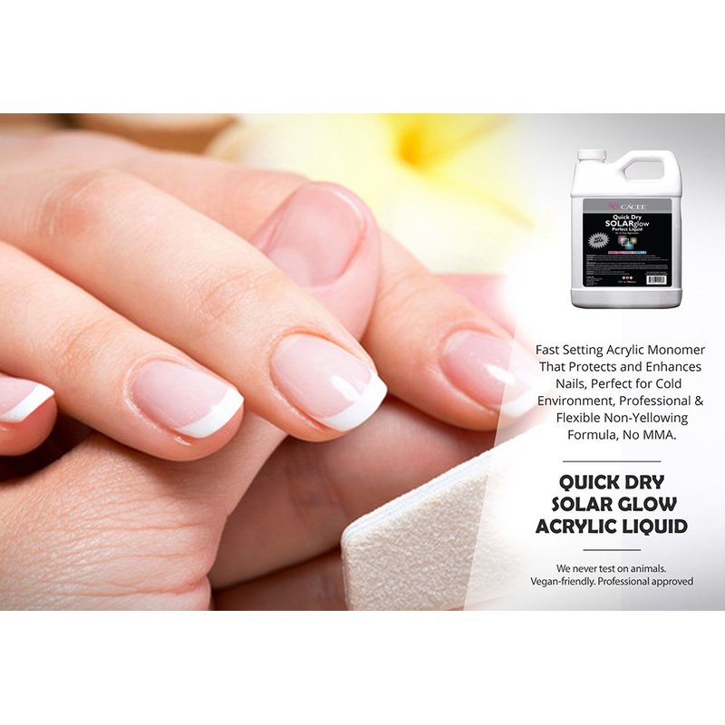- TRY THE KIT TODAY! Cacees Quick Dry Solar Glow Perfect Liquid is engineered for cold climates, so you dont have to sacrifice getting a perfect mani for low temperatures! With this durable liquid, you can create smooth transitions, detailed designs, and more. This MMA free monomer has superior flexibility and non-yellowing, non-brittle quality with exceptional adhesion and self-contouring performance.