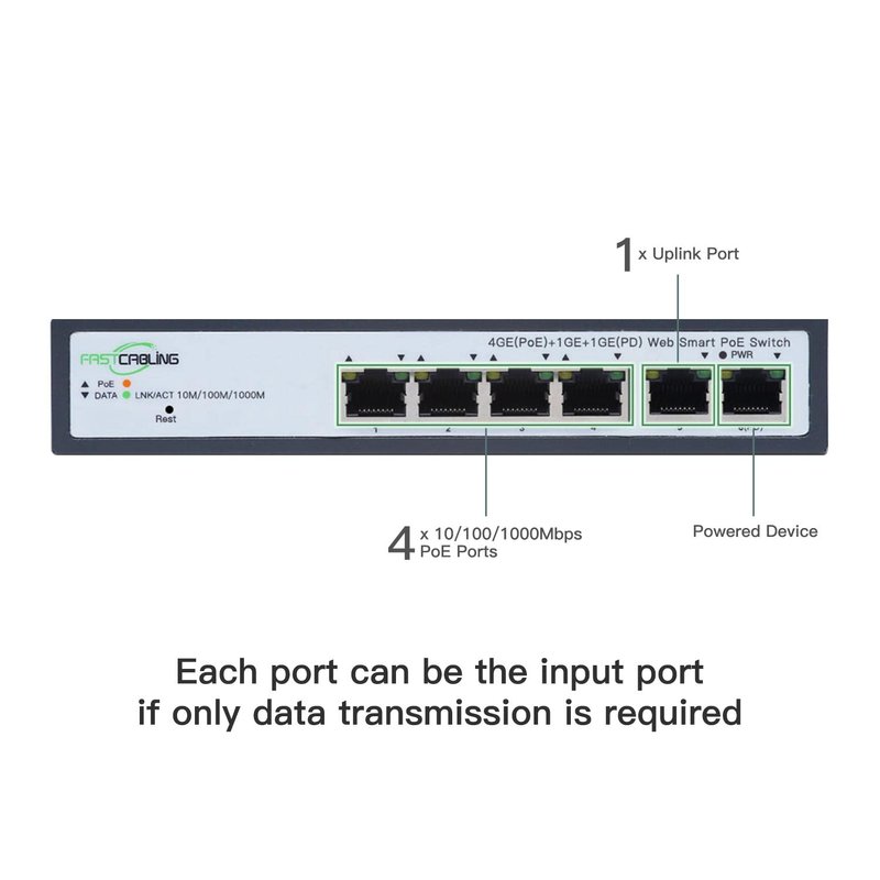 FASTCABLING PoE Passthrough Switch 4 Port, VLAN, QoS, Expand Network Port with Existed Cat5e/Cat6 Cable, Managed 60W PoE Powered Switch, IEEE802.3at/bt