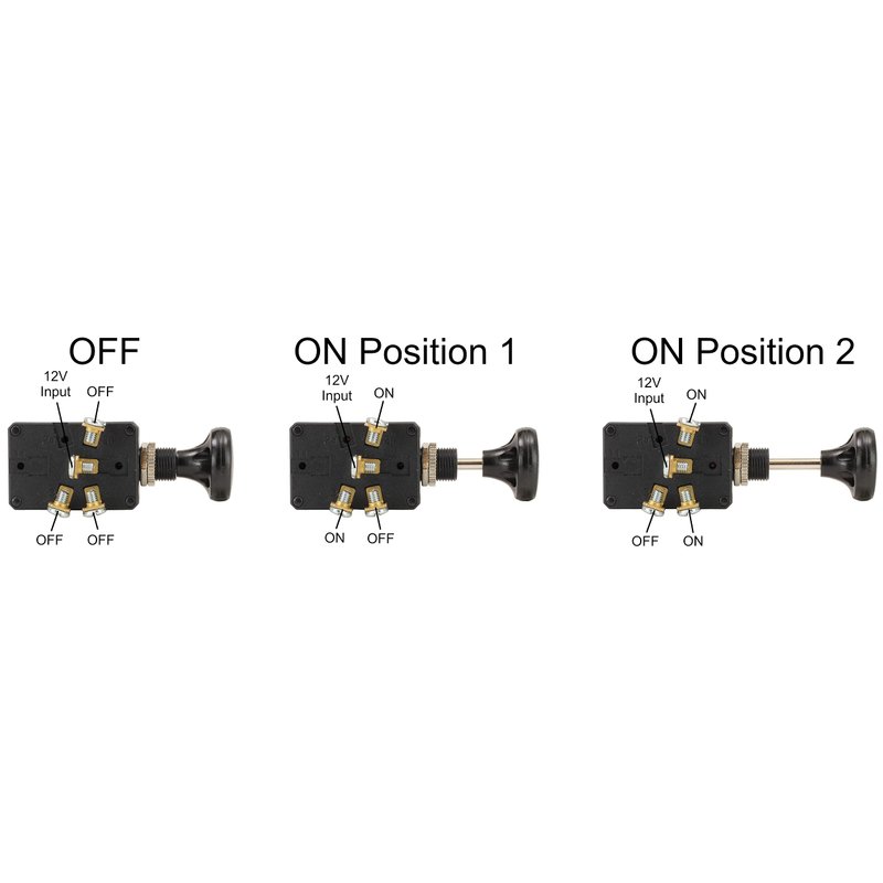 The Fastronix push/pull switch features 30A@14VDC rated screw terminals to handle many loads. Rating is 15A at 28VDC Switch can be mounted in panels up to 1/4" thick, simply drill a 7/16" hole, remove the threaded handle, install the switch using included hardware, and reinstall the screw handle. Switch is configured to allow one contact to supply power in both "on" positions (dash lights), one contact one supplies power in position 1 (parking lights) and the other contact only supplies power in position 2 (head lights).
