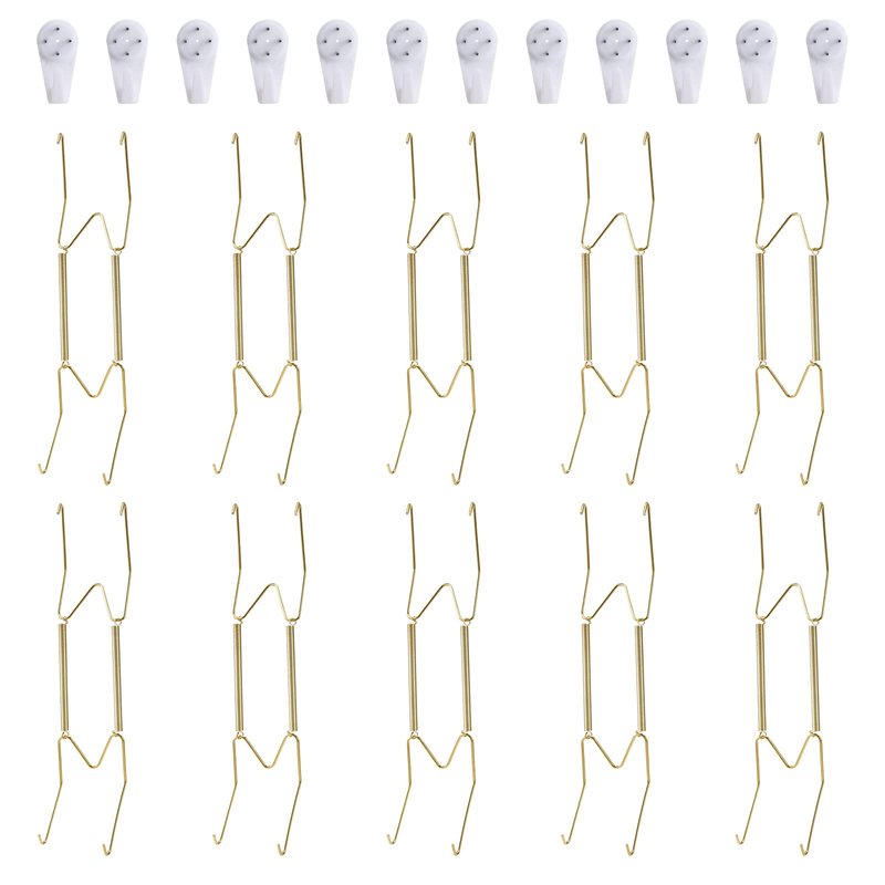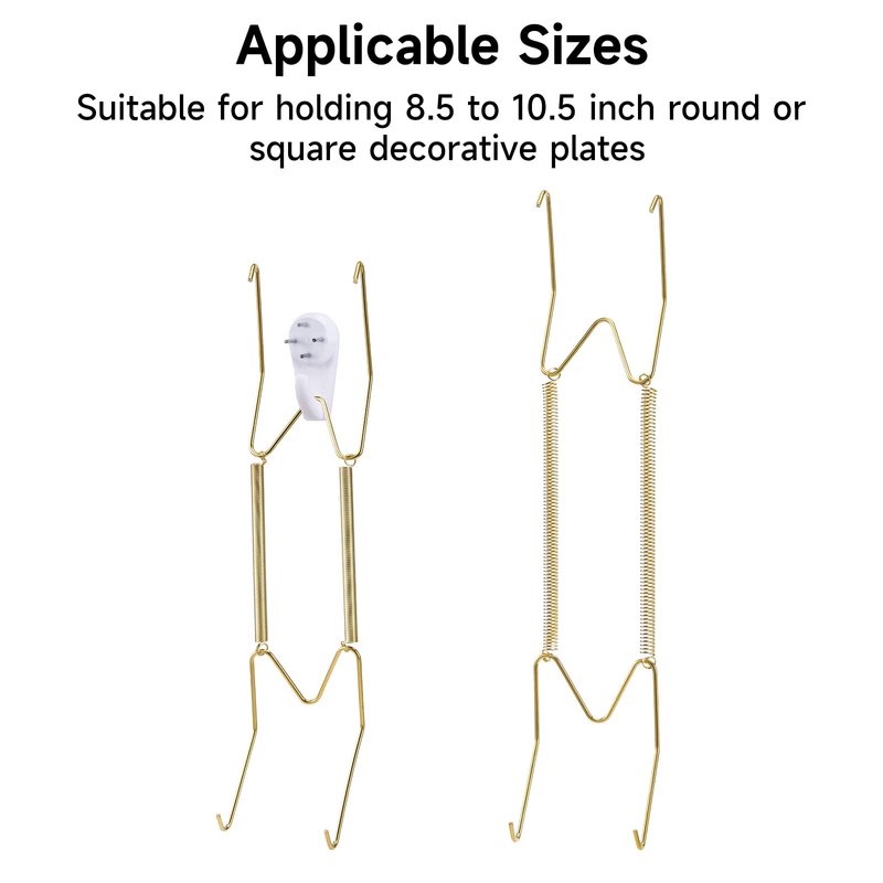 - [WELL MADE & PERFECT SIZE]: The wall plate hanger is made of top quality brass with golden color, well-made, sturdy, not easy to get rust. 10 Inch plate hangers, fit for holding 8.5 to 10.5 Inch round or square decorative plates.