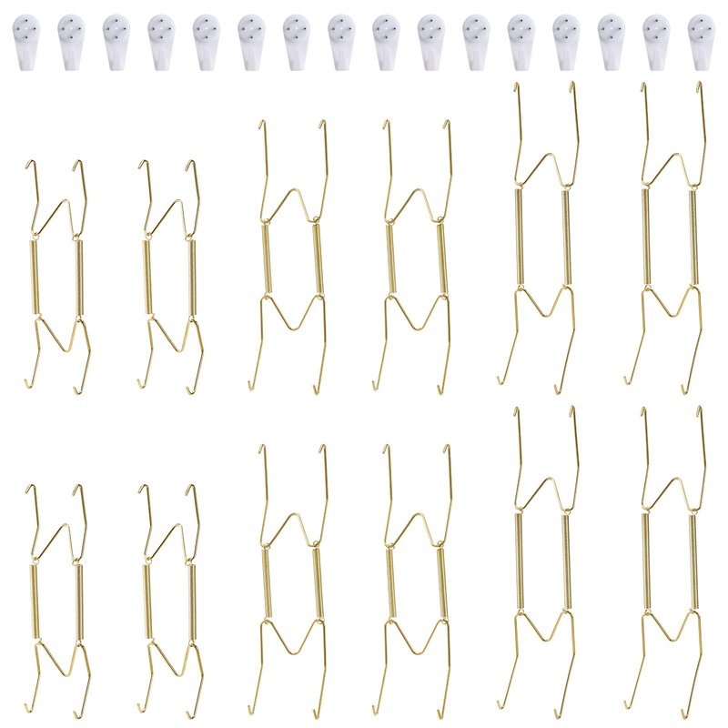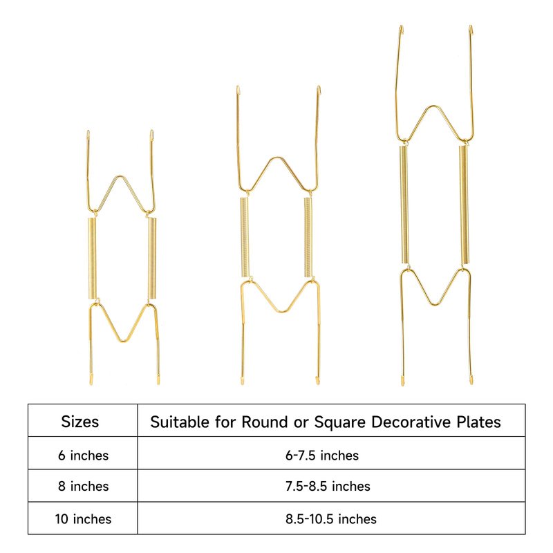 - [WELL MADE & PERFECT SIZE]: The wall plate hanger is made of top quality brass with golden color, well-made, sturdy, not easy to get rust. 6 Inch, fit for holding 6 to 7.5 Inch round or square plates. 8 Inch, fit for holding 7.5 to 8.5 Inch round or square plates.10 Inch, fit for holding 8.5 to 10.5 Inch round or square plates.