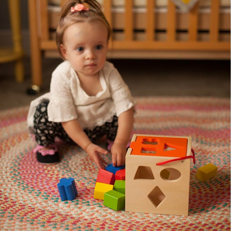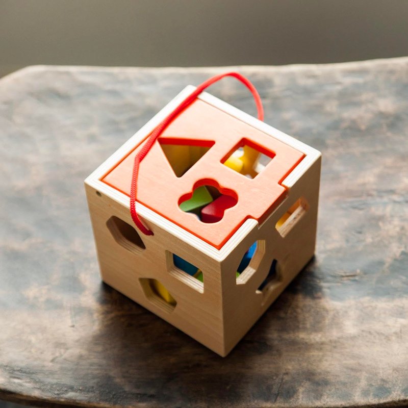 - Wooden box with cutout shape slots for matching colorful blocks