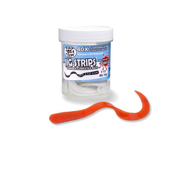 Fat Cow Fishing Jig Strips EEL Tail 3 1/2" x 3/8" - 40X Stronger Than Soft Baits - 10 Baits (Salmon Blaze)