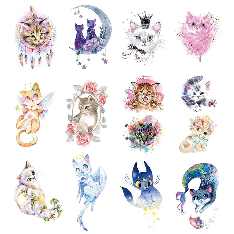 - Size: 10.5 x 6 cm / 4.13 x 2.36 inch. 12 sheets 14 piece cat temporary tattoo stickers, girls and boys body art decoration party supplies.