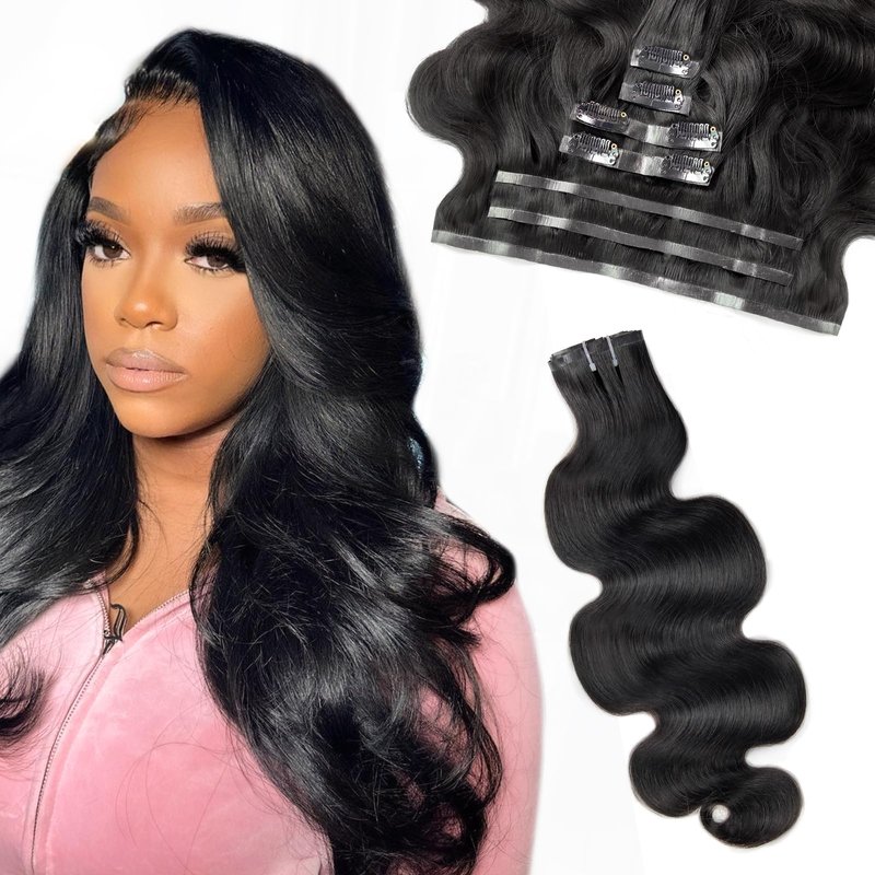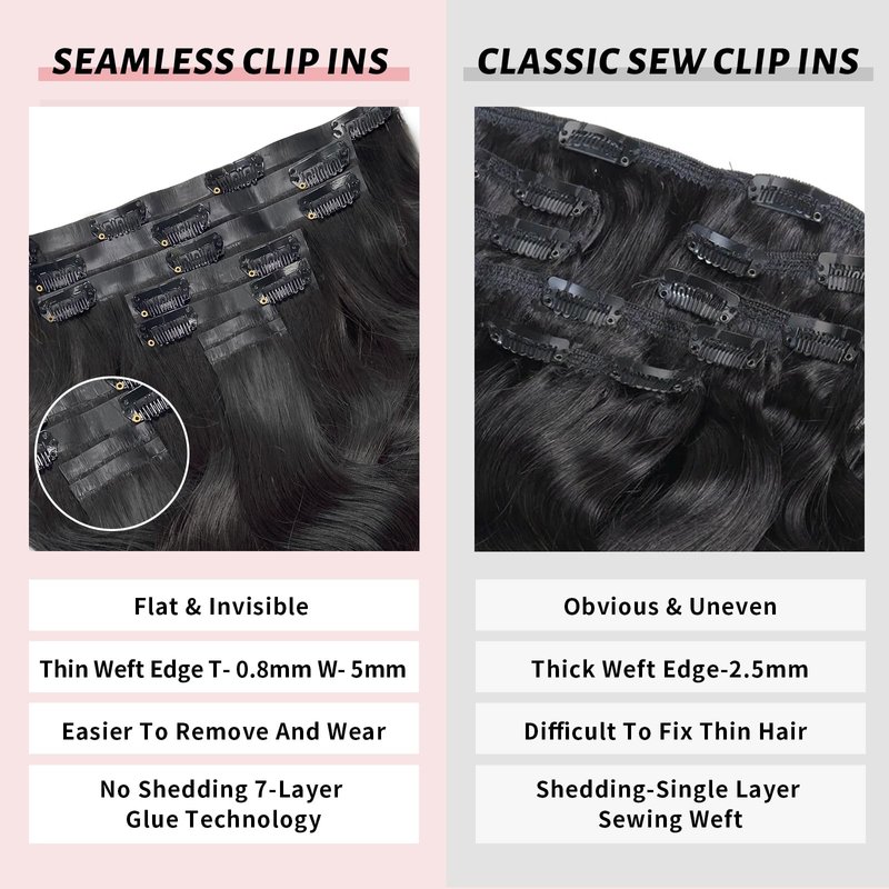 - 【Ultra-Thin Seamless Skin Hair Weft】PU Weft of body wave human hair clip in extensions black woman Ultra-thin 0.8mm, outside just 5mm. 1b Natural Black soft and PU clip in invisible hair extensions human hair, full and thick raw hair end.