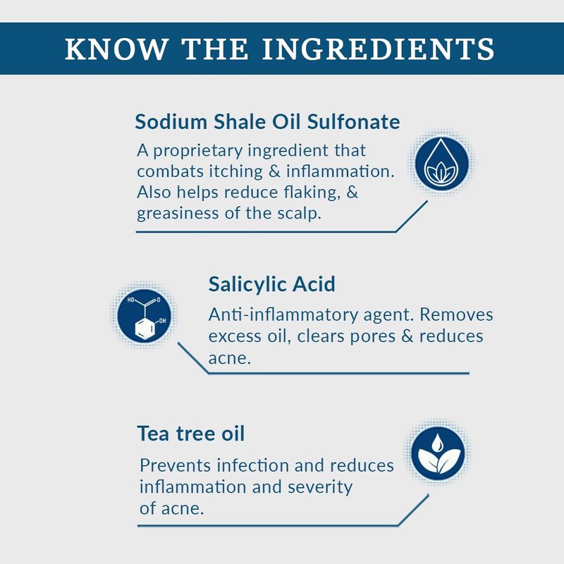 - KEY INGREDIENTS: Sodium Shale Oil Sulfonate, Salicylic Acid, Tea Tree Oil