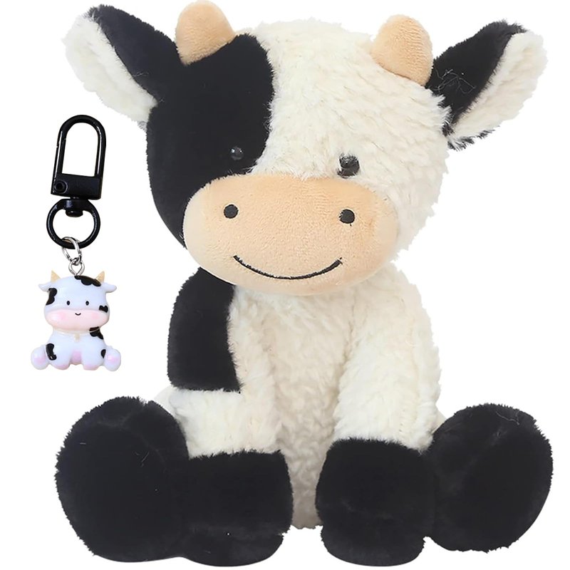 FCLEIH Cow Stuffed Animals, 9" Soft Cuddly Sit Cow and Cow Keychain, Cow Plush Animal Toy Great Gift for Kids (Black)