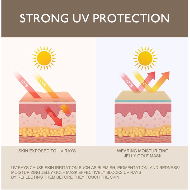 - [Breathable and Cool] This jelly sunscreen mask is made of functional elastic fabric, which is extremely breathable and cool to the touch. The unique ear-hanging design is suitable for all face shapes of men and women, ensuring a comfortable fit while providing reliable sun protection. Its unique cooling ingredients can help you effectively reduce skin temperature and prevent moisture loss on hot summer days