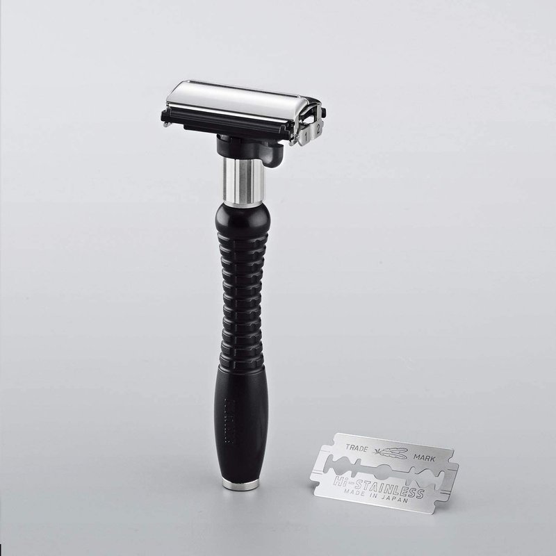 Feather’s Adjustable Double Edge Safety Razor features a straight, plastic handle with a twisting butterfly head opening, a stainless steel double edge blade, and adjustable blade exposure for the optimal shaving experience. The black handle provides a lightweight, secure grip of the razor. The shape of the shaving head, along with the stainless steel double edge razor blade, enables a skin level shave resulting in irritation-free shaving, regardless of the adjustable setting. Its butterfly twist shaving head is carefully engineered to allow a safe, no-touch method of changing disposable razor blades. Product includes two Hi-Stainless Razor Blades.